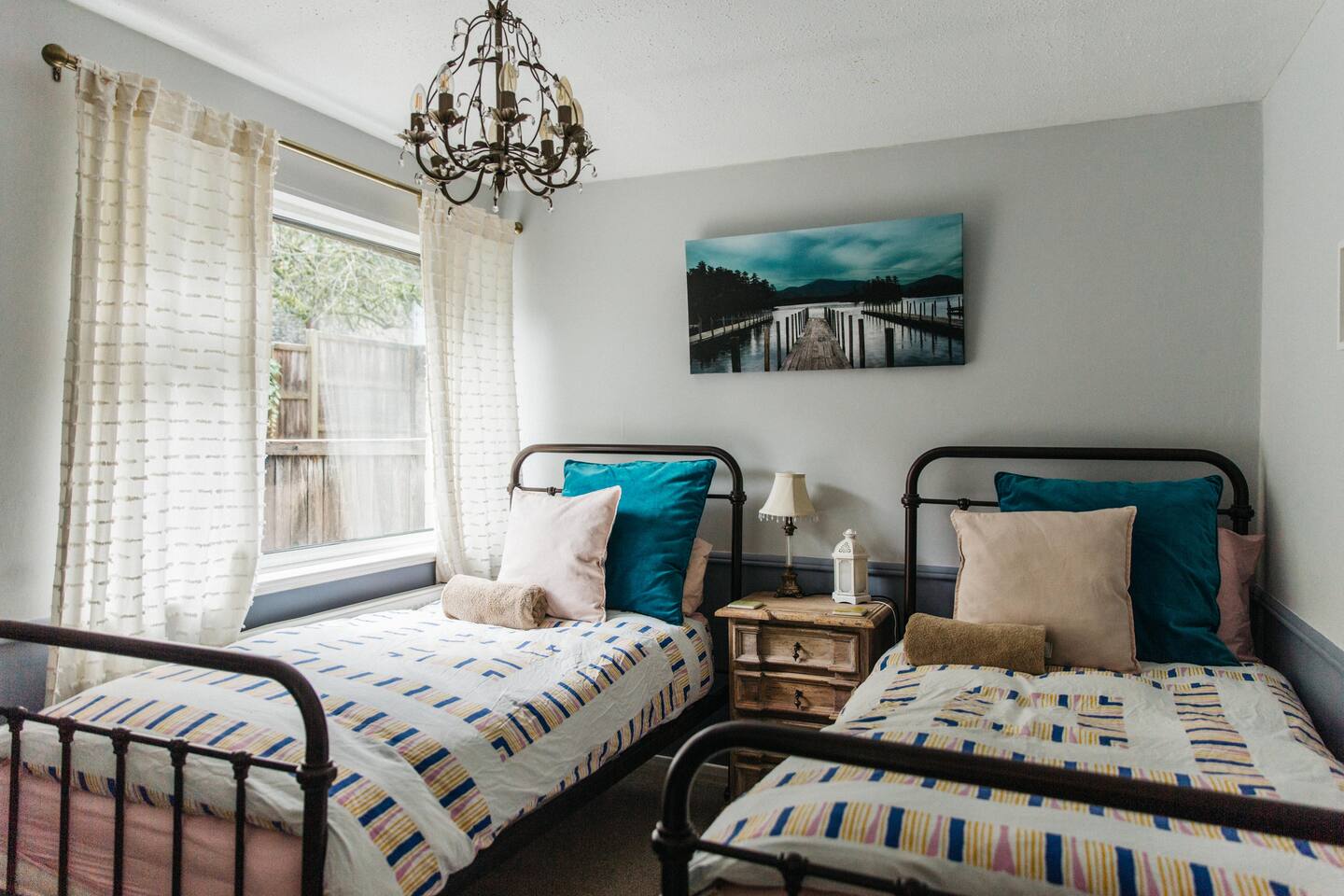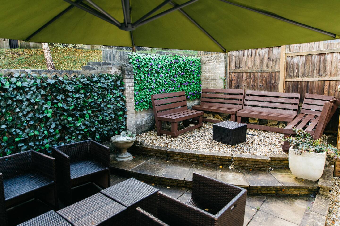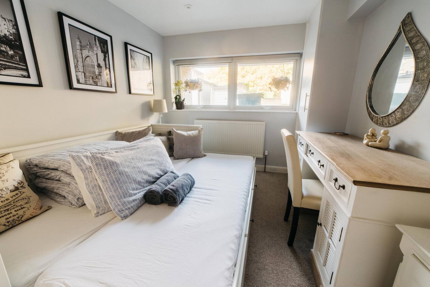 This stylish, 5 bedroom home, won’t feel like your standard Airbnb. It’s a home away from home, with all the comforts of your own place, so you can thoroughly enjoy your stay in Bath. This is the perfect home for 2 families to share. The ground floor has 2 bedrooms with Daybeds (one with a trundle). There is also a shower and separate toilet downstairs. The top floor has 3 bedrooms and a shower room with toilet. One upstairs bedroom has a super king bed, and room for a travel cot (provided on request). The other bedroom has two single beds (with a single bed mattress for the floor, if needed). The 3rd room upstairs is the smallest room, with a single daybed. The middle floor has an open plan living/dining room, with a separate kitchen. The designer living room is equipped with a 50” plasma screen, with Netflix. There is a selection of board games to enjoy, and an Xbox with 100+ games & multi-player subscription. The kitchen is well equipped for all your catering needs during your stay. The back patio is a sun trap all day, with a large umbrella, and seating for your whole party.