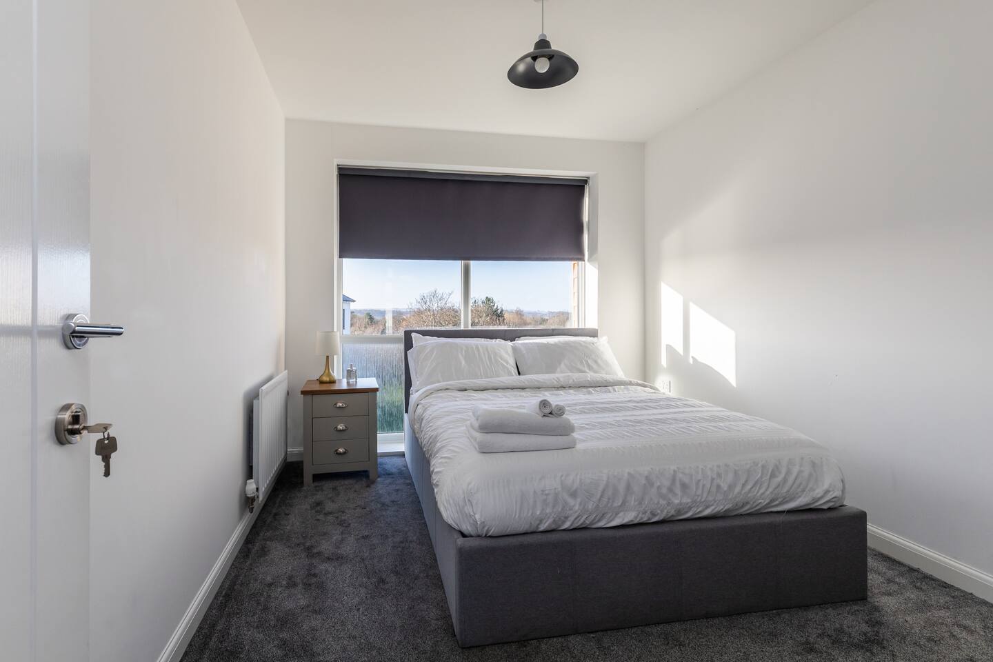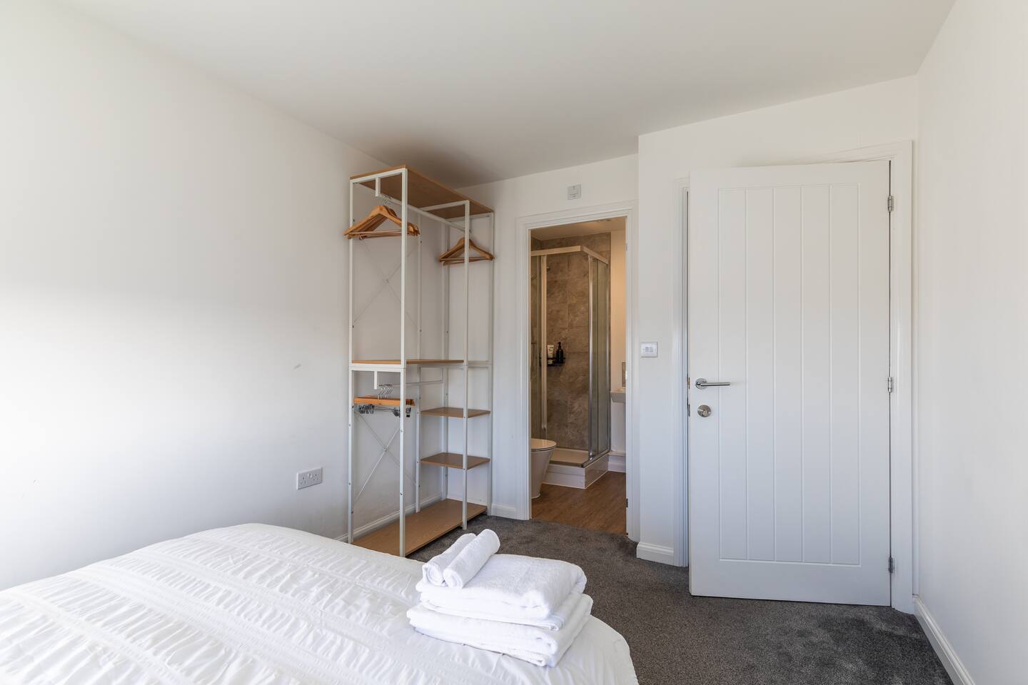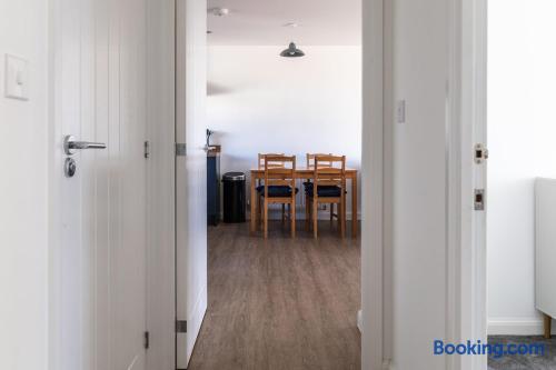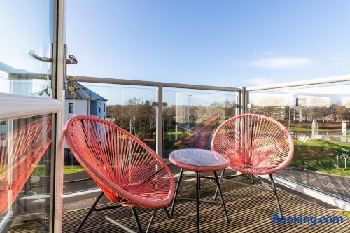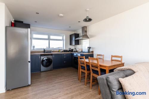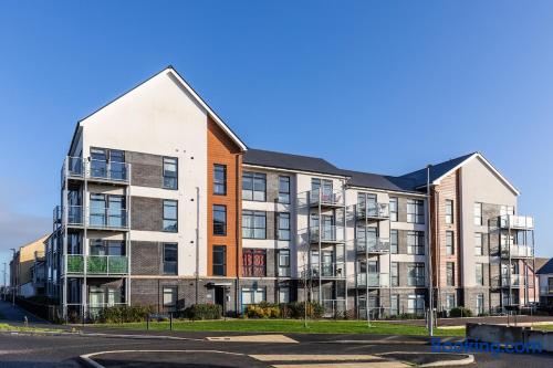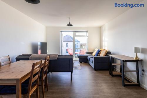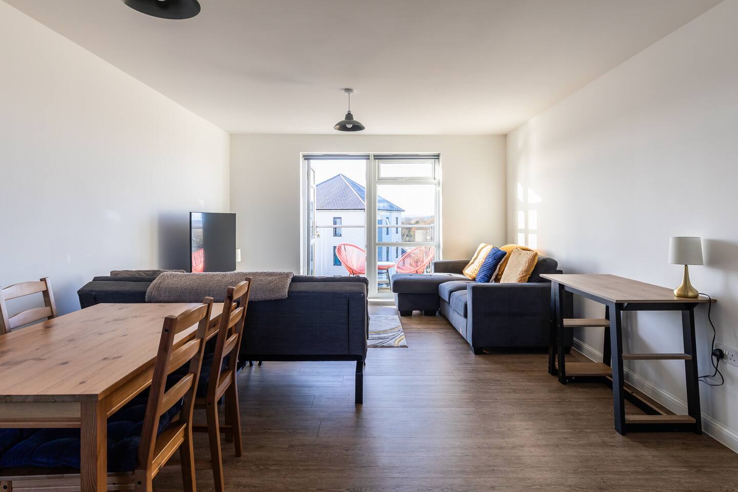 This 61 sqm apartment is bright and spacious, featuring an open-plan living, kitchen, and dining area designed for comfort and relaxation. Step out onto the private balcony, complete with outdoor seating – perfect for a morning coffee or unwinding in the evening. Two double bedrooms, including: One bedroom with an ensuite bathroom (shower) A second double bedroom with easy access to the main bathroom Main bathroom with a bathtub Sofabed in the living area to accommodate an extra guest Fully fitted kitchen for home cooking Dedicated desk for remote working Smart TV with access to streaming services (no regular TV channels) Free private parking for one car Free on-street parking also available Why You’ll Love It ✔ Modern, newly built apartment ✔ Top-floor position ✔ Bright, airy interiors with plenty of space ✔ Ideal for short stays or longer visits
