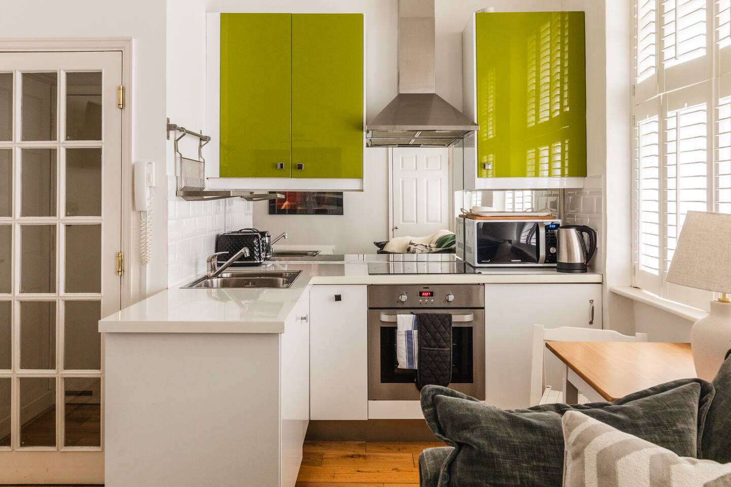 🛏️ Your Space Relax in your king bedroom featuring soft linens, cosy décor and calm colours — a restful retreat after a day exploring Bath. A desk in the bedroom offers a dedicated workspace and Wi-Fi throughout — perfect for remote working or planning your days in the city. 🍳 Open Plan Living The heart of the home is the open plan kitchen and living area, thoughtfully furnished and fully equipped for your stay: Fully fitted kitchen including kettle, toaster, microwave, oven, hob and small fridge/freezer. Comfortable seating to enjoy the Smart TV to stream your favourites - perfect for cosy movie nights in 🌿 Outdoor Relaxation Step out to the shared back garden, accessed via the building hallway — a lovely space with outdoor furniture where you can enjoy your morning coffee or a glass of wine. 🧺 Practical Touches Guests Love Thoughtful amenities include: Washer + drying rack — great for longer stays Iron & ironing board Hairdryer Fan for warmer days