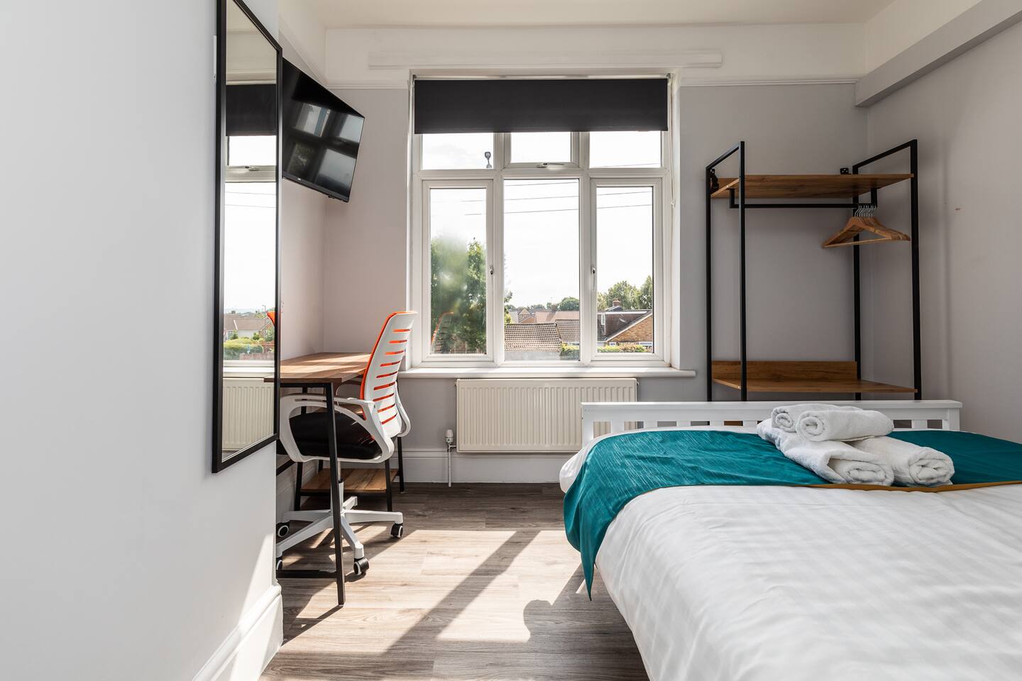 Dove Court Travel Lodge welcomes you in our comfortable double room with ensuite bathroom attached. Chair and desk for remote working (500Mbps wifi speed), double bed with fresh linen & towels, hangers for your clothes, smart TV, and a small fan for the warmer days. Your room and attached bathroom are private and locked. Your room is on the first floor. The kitchen & dining area are shared and fully fitted. Big fridge freezer, microwave, oven, hob, toaster, kettle, coffee machine are there for your convenience. There is also a laundry room with washer and dryer.