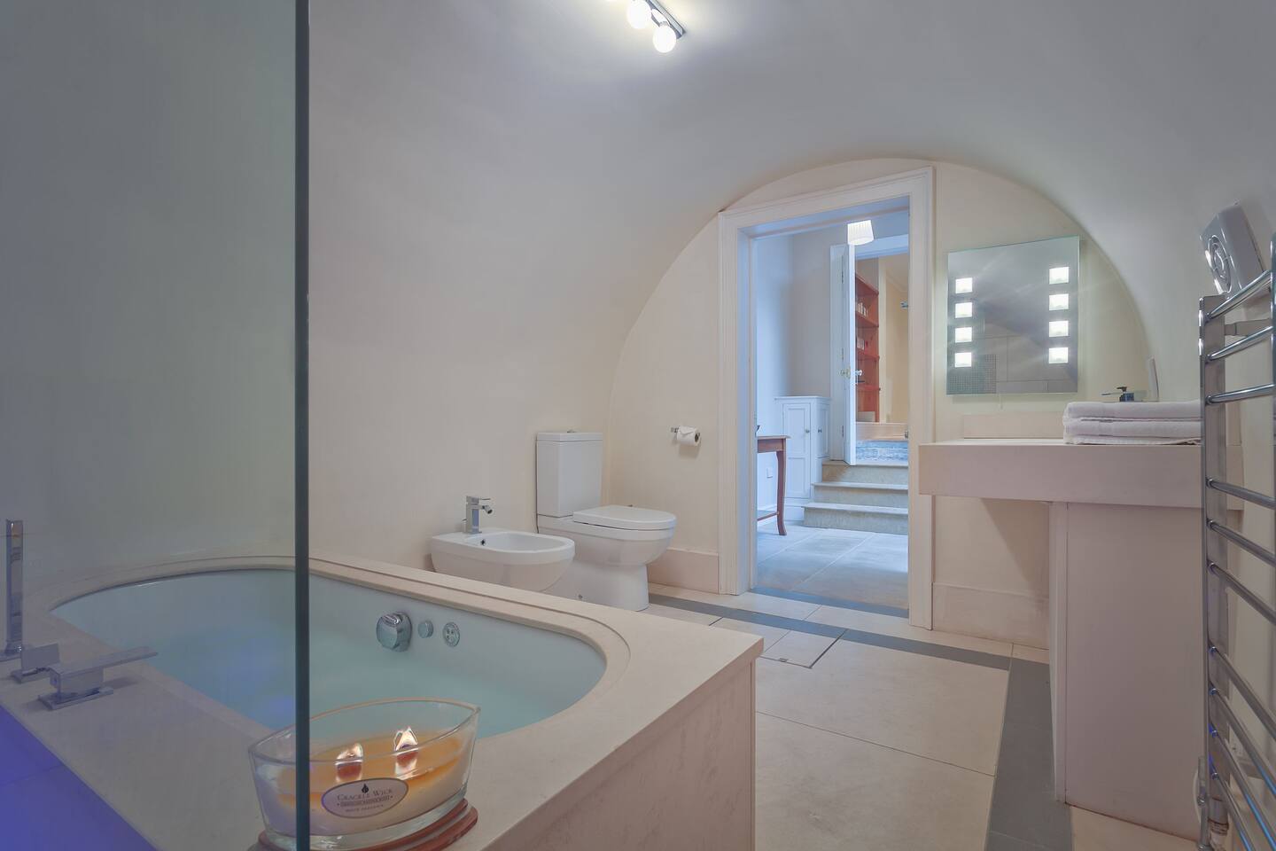 Ground and lower ground floor of a Georgian Townhouse. The ground floor has a comfortable lounge and a fully fitted modern kitchen with dining table. There is a shower room & toilet on the half landing and a flight of stairs leads down to two comfortable bedrooms, each with a TV and the vault which has been converted to a stunning bathroom with a jacuzzi bath and shower. A further flight of stairs leads to the garden.