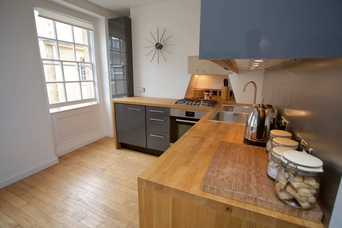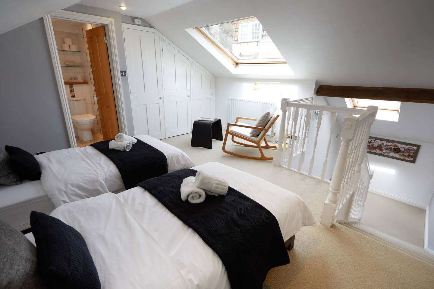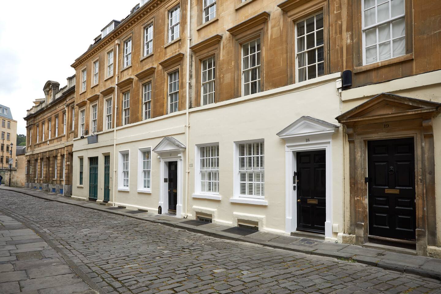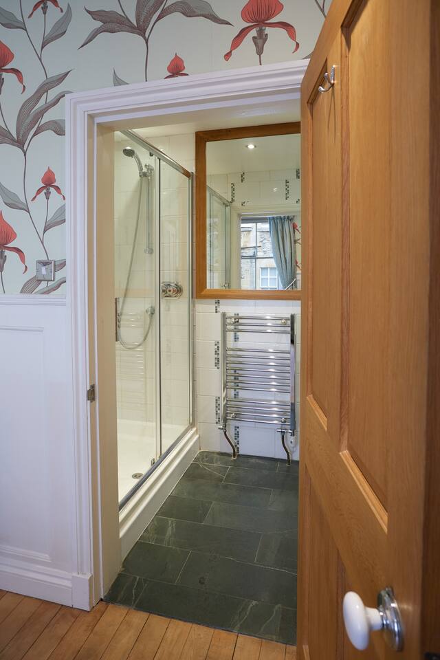 This is a very spacious 2 bedroom, 2 bathroom apartment which begins on the second floor of this graceful building and offers views over one of the oldest streets in Bath; Old Orchard Street, where the original Theatre Royal was once located. BEDS: The lovely master bedroom has a king-sized painted brass and iron bed and a large shower room en-suite. Upstairs in the second bedroom, the beds can be arranged as a super-king or twin beds, depending on your requirements. This second bedroom also has a pretty en-suite bathroom. BATHROOMS: 1 large shower room en-suite to double bedroom and 1 small bathroom en-suite to twin bedroom. LOUNGE: Jack's has an open-plan living room, with ultra modern kitchen and dining area and has views from three Georgian windows out to Old Orchard Street. What makes Jack's flat remarkable is how the building's period features blend so well with its chic modern decor. There is a gracious communal courtyard garden at the back of the building that is accessible to all the residents in these ancient buildings and is a perfect spot to quietly relax away from the bustle of this exciting city. This is a wonderful flat, spread over two floors, providing both romance and luxury as well as all the comfort and roominess you might need for a family get-away.