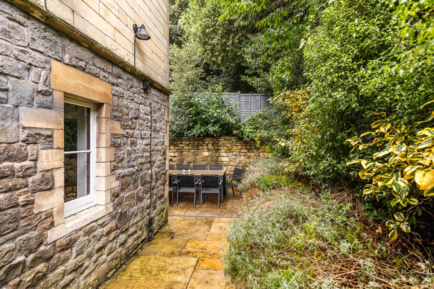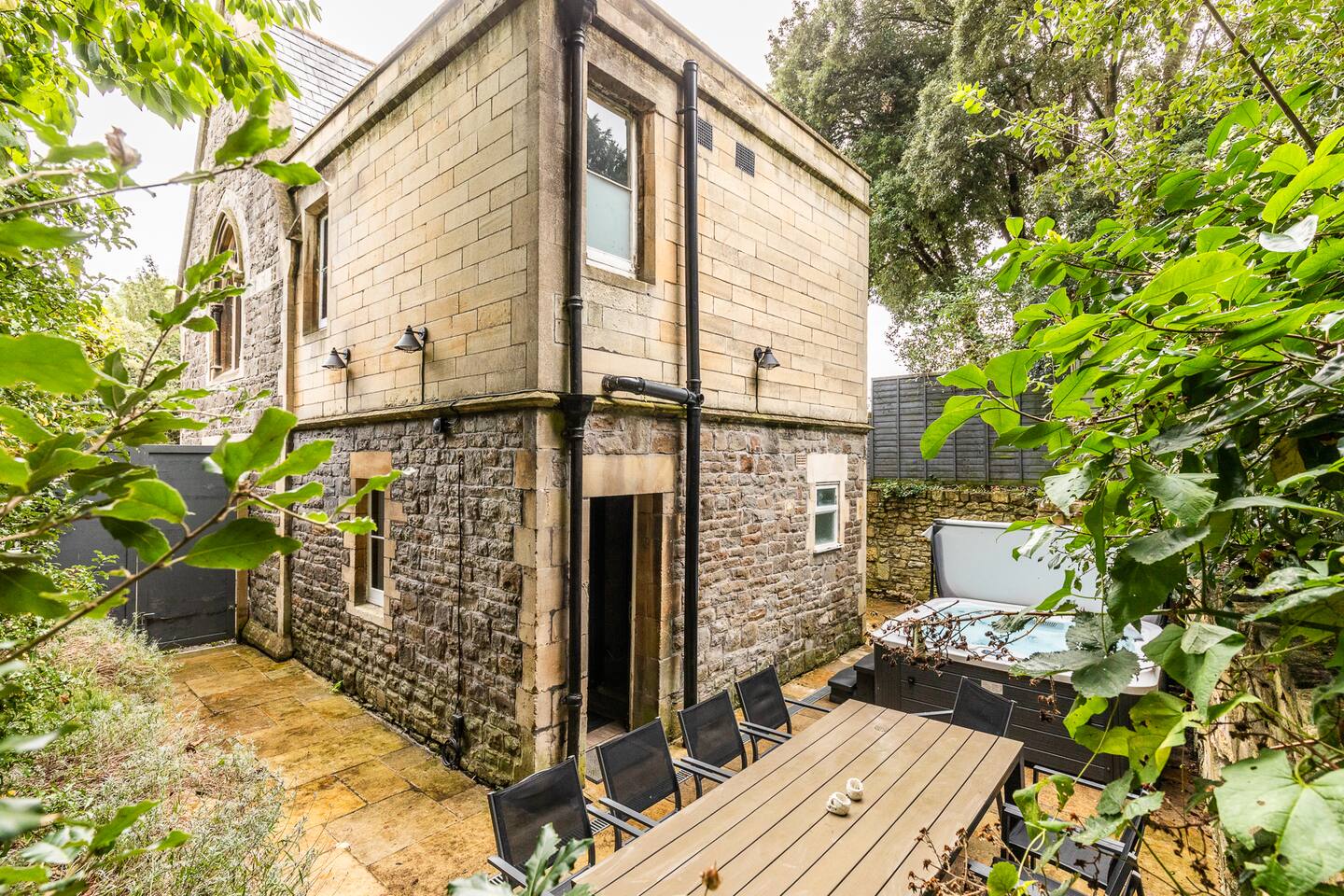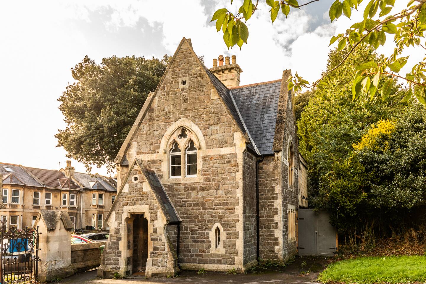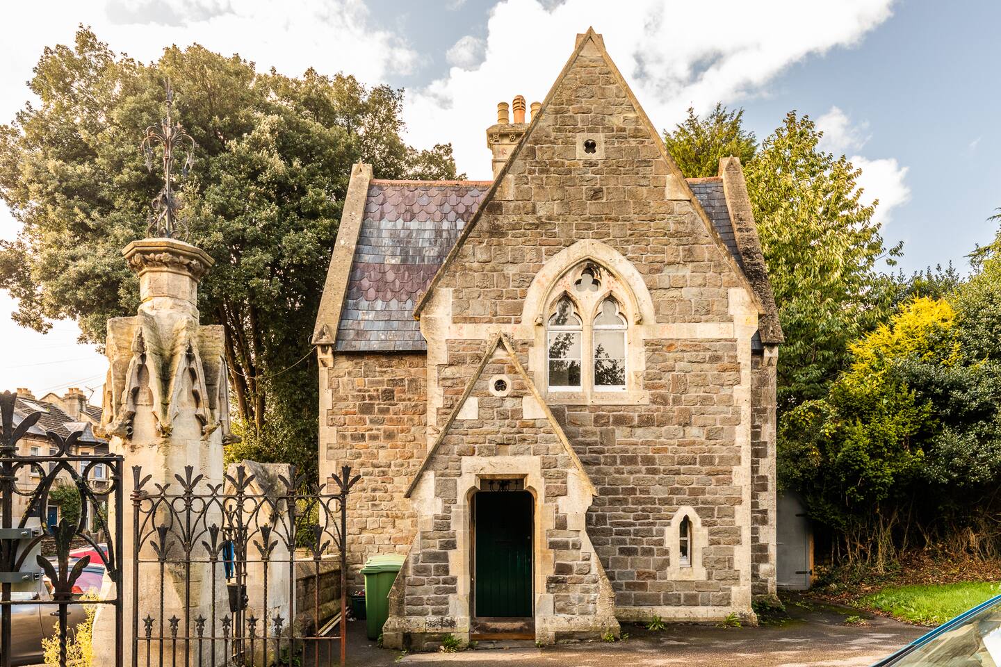 Surrounded by the lush greenery of one of Bath’s historic cemeteries, this beautiful and newly refurbished lodge house sleeps up to 10 guests in comfort and style. The Grade II listed building has been lovingly converted into a stunning four-bedroom holiday home with a generous well sheltered garden not overlooked by any neighbours. It is ideal for larger groups wishing to explore Bath and the surrounding area. The lodge has a large and fully equipped kitchen including oven, induction hob, microwave, fridge-freezer, dishwasher and washer/dryer as well as utensils and dining sets for at least 10 people. A special wine cooler will keep your favourite bottles stored just at the right temperature. Next to the kitchen is the living room with an expansive sofa, which can be extended into a double bed, and 43-inch smart TV. A master bedroom is on the ground floor with a king-size bed and toilet & shower room next door. You can exit into the paved garden through a door at the back of the house, where you'll find a barbeque and table & chairs ready for some al fresco dining when the sun comes out. Upstairs guests you will find three more bedrooms, a second master bedroom boasting a super-king double bed, one room with two zip and link singles that can be joined to form a super-king double bed, and one twin room with two single beds. A family bathroom with a bath, shower and toilet is also on the first floor. The property has been elegantly refurbished in a classic contemporary style in keeping with the mid-19th century building’s heritage and Gothic architectural detail. There is wifi throughout the house and private off-street parking for two cars. There is also free on-street parking, but finding spaces can be a challenge sometimes. There is CCTV monitoring the car park and the outside of the house. The lodge is just 25 minutes walk along the River Avon from Bath’s historic centre making it a great Bath city break base.